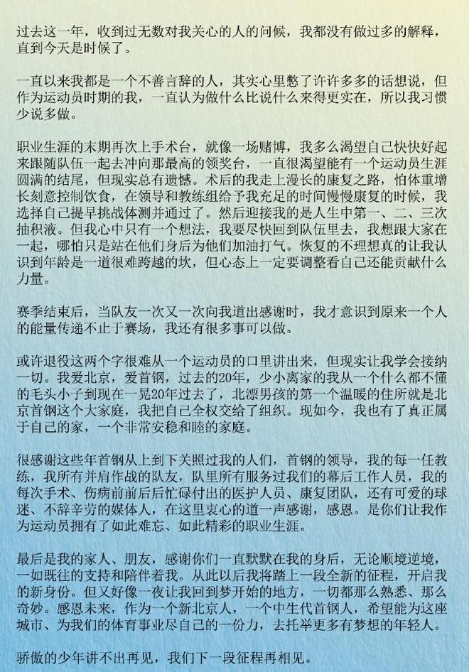 20年首钢人代表了我整个青春,还想再用至少20年来回馈组织的厚爱。曾经的我是幸运的,未来的我想把这份幸运换一种身份传递给更多后备力量们。星星之火,可以燎原,愿北京篮球、首钢篮球越来越好,荣辱与共,始终有我。