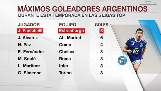 此外,帕尼切利也是目前在五大联赛效力的所有阿根廷球员中,联赛进球最多的球员(8球)。在他身后有西甲打入6球的阿尔瓦雷斯,意甲攻入4球的尼科-帕斯,3球的乔瓦尼-西蒙尼以及同样攻入3球的劳塔罗,以及在英超打入3球的恩佐等人。